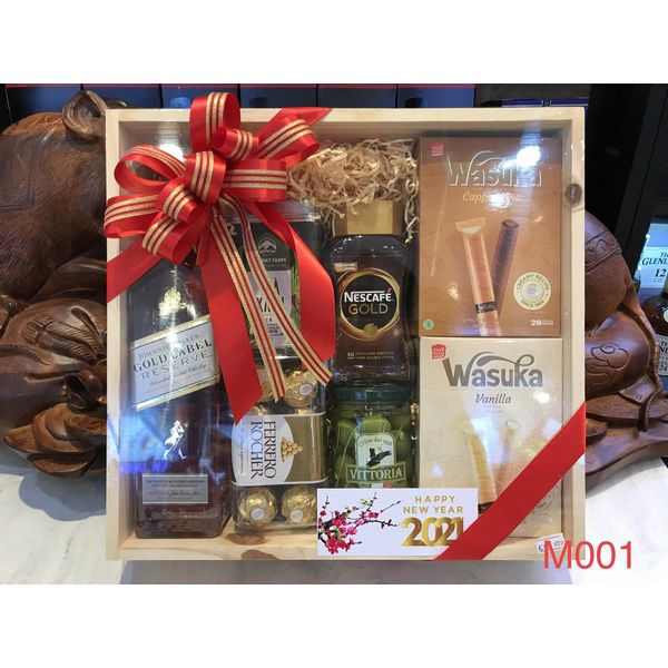 M001 - Hộp quà gỗ cao cấp Tết 2022, rượu Gold Labed cao cấp