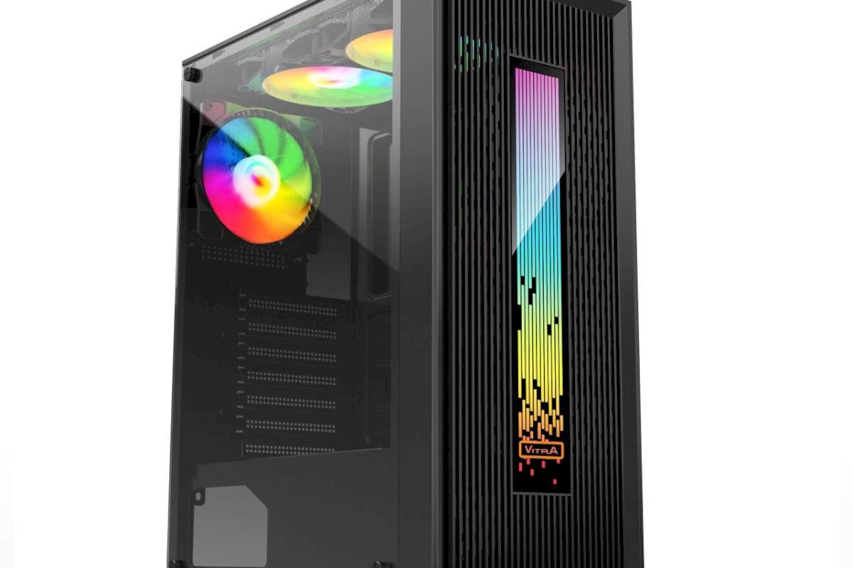 Vỏ máy thế hệ mới Vitra CERES V308 ARGB Kèm 1Fan RGB mang phong cách hiện đại và thời trang, với thùng máy ATX kích thước 340*192*445mm cho phép hỗ trợ các dòng mainboard chuẩn ATX / MATX / ITX , dễ dàng đi dây hay tháo lắp CPU dễ dàng mà không cần tháo mainboard, thiết kế thông minh cho phép người dùng có thể tự built bộ máy DIY tháo lắp dễ dàng. Hệ thống hỗ trợ tản nhiệt CPU cao tối đa 160mm, VGA card dài 280mm, 2 SSD, 2HDD, 7 khe PCI đáp ứng được nhu cầu mở rộng cho cấu hình máy Gaming, đồ họa tầm trung. Khả năng hỗ trợ tới 6 quạt làm mát, hệ thông khe thoáng gió thông minh hút gió trước mặt và dưới đáy thùng máy giúp hệ thống mát mẻ một cách tối ưu. Khung thép dày 0.45mm chắc chắn cùng lớp sơn tĩnh điện dày, sườn mặt kính cường lực đem đến hình thức sang trọng và bắt mắt cho thùng máy trong khi duy trì được mức giá cực kỳ hợp lý.
